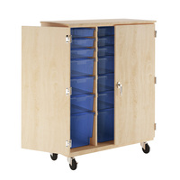 Cabinet is finished with an earth friendly UV finish. Clear sturdy glide and tilt tote tray runners prevents totes from falling out. Comes with 6 single totes (12-1/4"W x 16-3/4"L x 3"H), 6 double totes (12-1/4"W x 16-3/4"L x 6"H), and 2 quad totes (12-1/4"W x 16-3/4"L x 12"H). Constructed from maple hardwood and veneers with a finished wood top. Door unit has three-point locking handle system. Features Euro-Series (high-impact polystyrene) translucent totes: clear, royal, carrot, or lime. Includes backpack/coat space (13"W x 37"H) with interior hook.