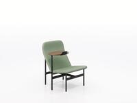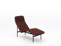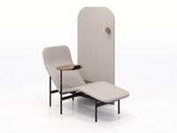 The Avalon collection features a lounge chair, chaise lounge, and coordinating accessories. Crafted with soft, sculpted forms set against a thin steel frame, its distinctive split design for the seat and back is visually light and engineered to minimize packaging size, reducing its carbon footprint. Both the lounge chair and chaise can be paired with optional accessories – a swivel table and/or screen with a side table and coat hook – offering adaptability for privacy and additional table space, ideal for work or device usage.