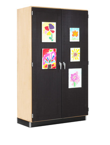 Storage and display space combined! This unique storage cabinet gives you lots of storage space without losing any display area. The locking maple cabinet has a fixed bottom and middle shelf and four adjustable shelves. All the shelves are 1" thick and can hold up to 40 lbs. per square foot. The doors of the unit are framed and covered with a black canvas mesh. The entire door area can be used to hang artwork or posters.