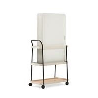 The Collaborate Board Cart was designed for mobile markerboards. It can hold and sort up to 7 tablet markerboards, plus up to 2 more on optional markerboard rails, and move them from space to space as needed. The Board Cart can function in various contexts, including educational, healthcare, or traditional office spaces.