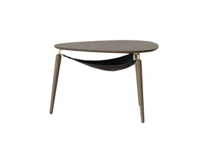 With its clean and minimal organic shape, as well as the combination of wood and fine metal details, the Hang Out table has a classic Scandinavian expression. Solid oak, laminated veneer, dark brown leather, brass plated steel.