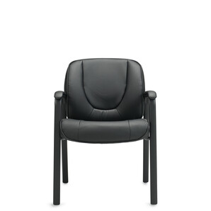 The Luxhide Guest chair features black Luxhide upholstery with mock leather trim and a black epoxy powder coated steel frame with upholstered armrests.