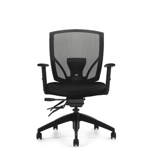 The Mesh Multi-Function chair features a black mesh back with breathable mesh fabric seat and height adjustable arms. Find your fit with a pneumatic seat height adjustment, adjustable lumbar support, infinite seat lock with tilt tension adjustment, back angle adjustment, and forward tilt control.