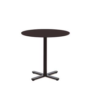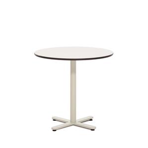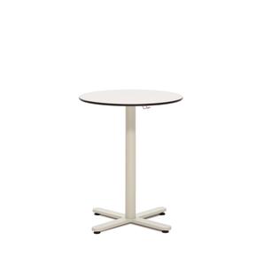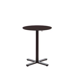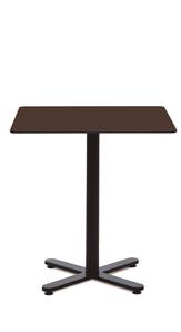 Chair-height table with cross-shaped central base in painted finish. Round or square top in high-pressure phenolic finish. Also available in bar height with round top. Includes hanging bracket for purse/bags.