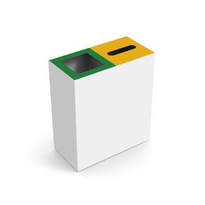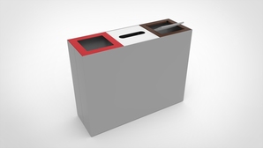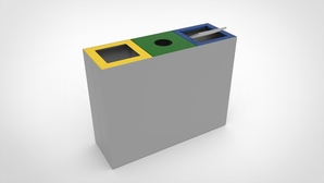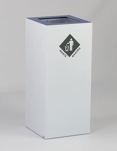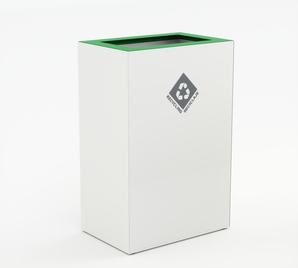 Single, double and triple compartment painted steel waste receptacles with bag rings and removable tops with Waste, Paper, or Circle standard lids (choose 3) or optional counter-balanced swing lid(s). Total capacity 48 gallons. Includes three optional icons.