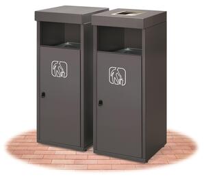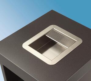 Designed by Mattiussi Ecologia Spa, RETTO is a sturdy, front-loading receptacle with 26-gallon capacity that combines strong functional elements and rectilinear design. Constructed of steel plate finished in Textured Bronze paint, RETTO features a generous access opening, a locking front door and an internal galvanized liner. RETTO can be secured to the ground and is available with or without an ashtray on top.