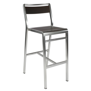 Sid is an outdoor/indoor barstool with wood-look aluminum slats. Aluminum frame.