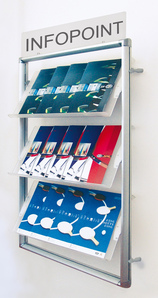 Wall mounted magazine or catalog display with three shelves that are adjustable in height on frame. Silver Anodized Aluminum frame, shelves in Satin Acrylic. Also available with set of two Silver mounting brackets for top of Wallmate to hold signage up to 1/8” thick.